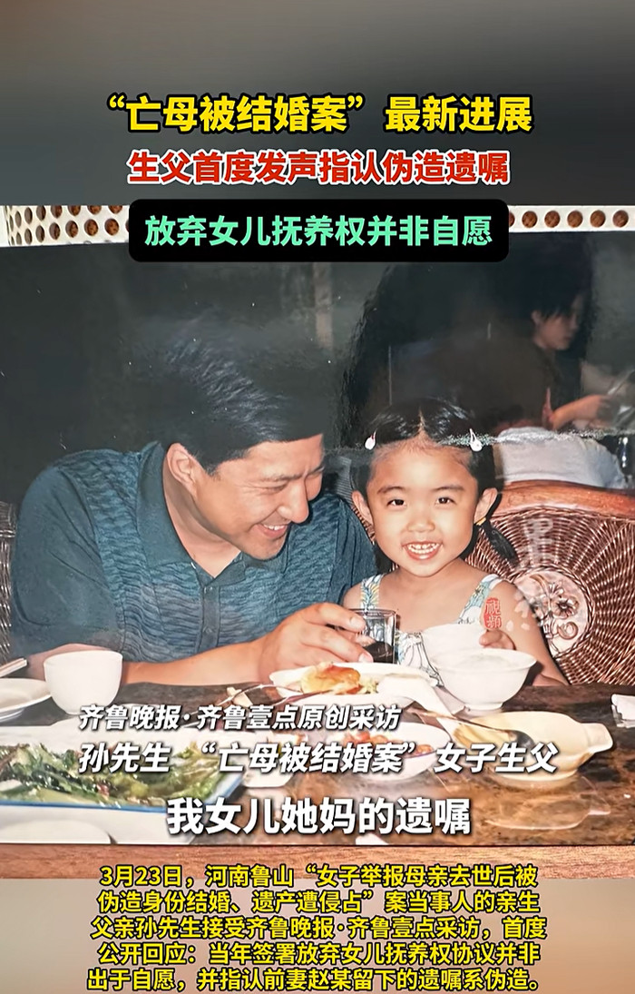 3月23日,河南鲁山“女子举报母亲去世后被伪造身份结婚、遗产遭侵占”案当事人的亲生父亲孙先生接受齐鲁晚报·齐鲁壹点采访,首度公开回应:当年签署放弃女儿抚养权协议并非出于自愿,并指认前妻赵某留下的遗嘱系伪造。
